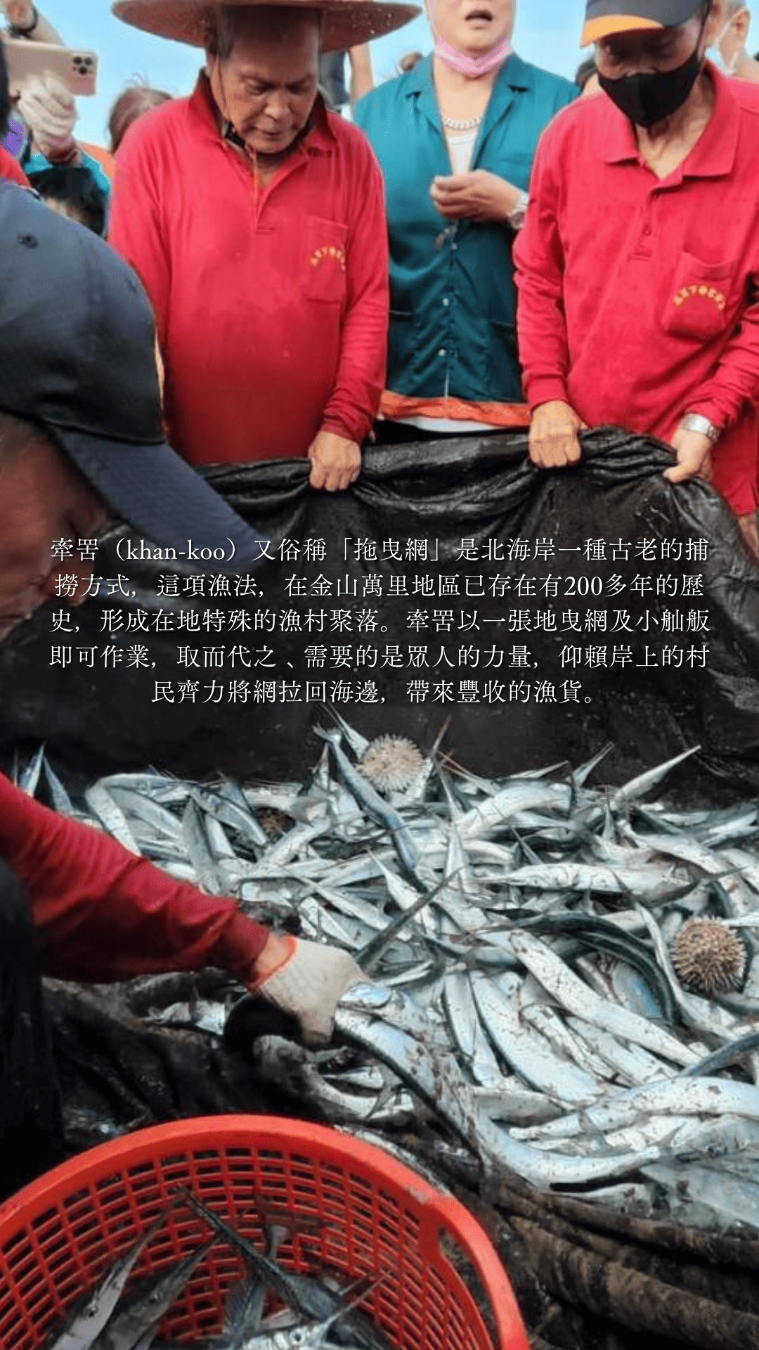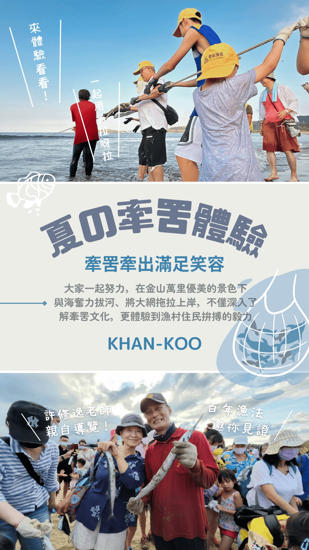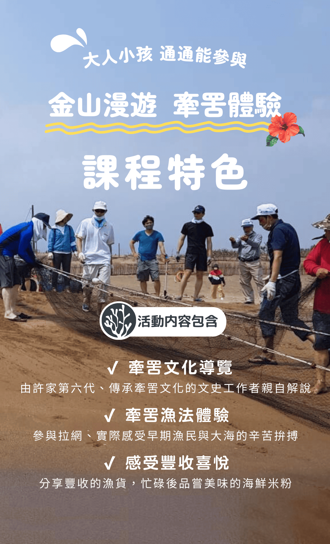 牽罟又稱「拖曳網」是北海岸一種古老的捕撈方式,兼顧漁業以及環境共生。由經驗豐富的船長駕駛舢舨船出海,將網具拖離岸邊、並在沿海撒網來包抄魚群,將近海魚類都收進網內,再藉由岸上眾人的力量,不分男女、大人小孩,如同拔河一般、齊心將漁網拖拉上岸!