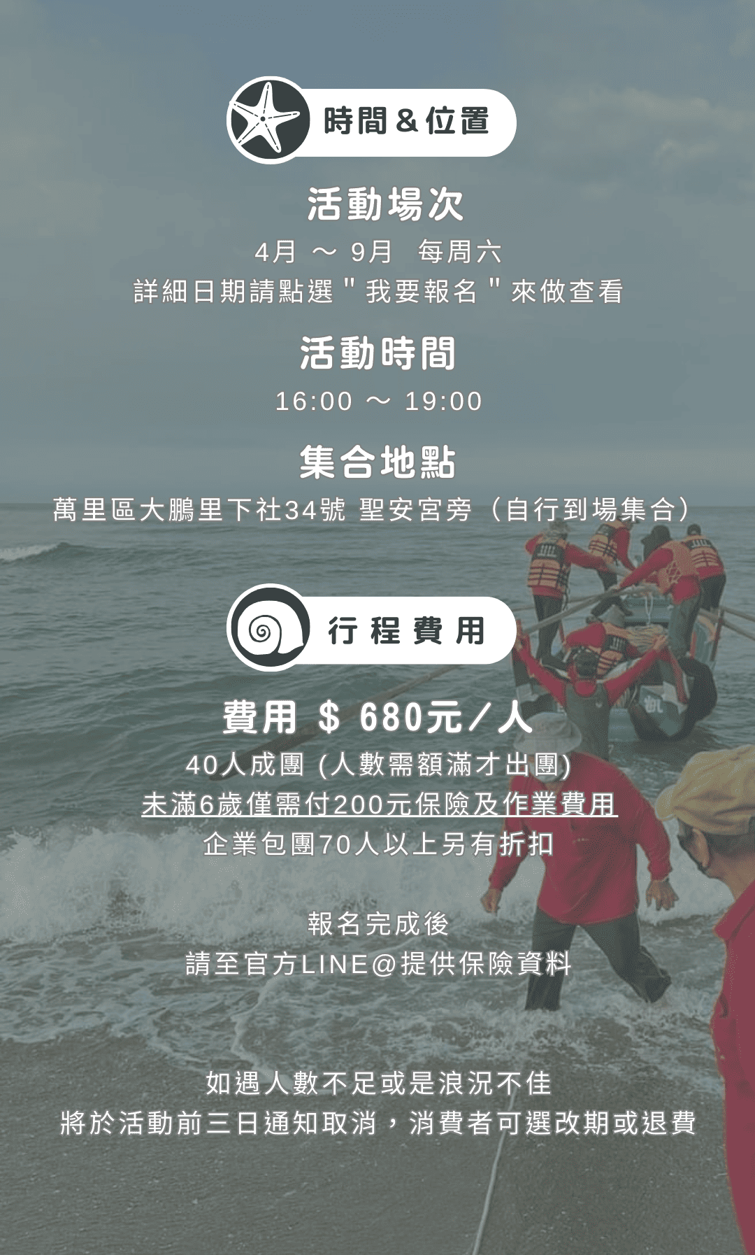 牽罟體驗.注意事項報名完成後,請加入官方LINE@提供保險資料